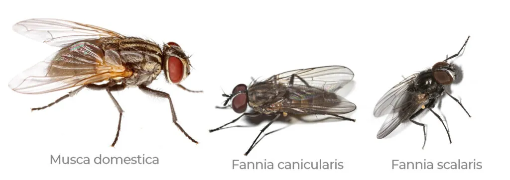 La mosca doméstica (Musca domestica) es el díptero más difundido en ambientes urbanos y rurales. Mide entre 6 y 7 mm, con tórax gris y cuatro bandas negras longitudinales. Su abdomen es gris amarillento, las alas poseen una vena R5 divergente y la probóscide es esponjosa, adaptada para lamer líquidos. Deposita huevos en materia orgánica húmeda como basura o estiércol. Es diurna, prolífica y vector mecánico de bacterias y virus. Su control requiere combinar saneamiento con cebos insecticidas y tratamientos residuales. Dentro de esta familia, se incluyen las llamadas “pequeñas moscas domésticas”, con dos especies de importancia: Fannia canicularis y Fannia scalaris. Ambas miden cerca de 4–6 mm, son más esbeltas y presentan vuelo errático, característico por desplazarse en círculos bajo luces o techos.