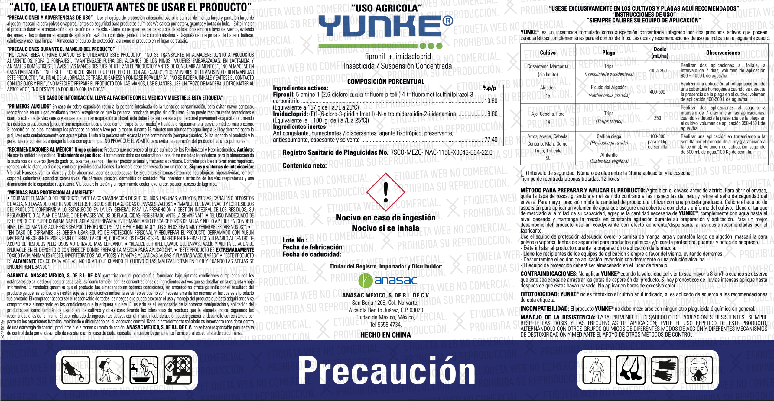 Insecticida formulado como suspensión concentrada, integrado por dos principios activos: Fipronil e Imidacloprid. Actúa eficazmente contra: Trips, picudo de algodón, gallina ciega y alfilerillo.